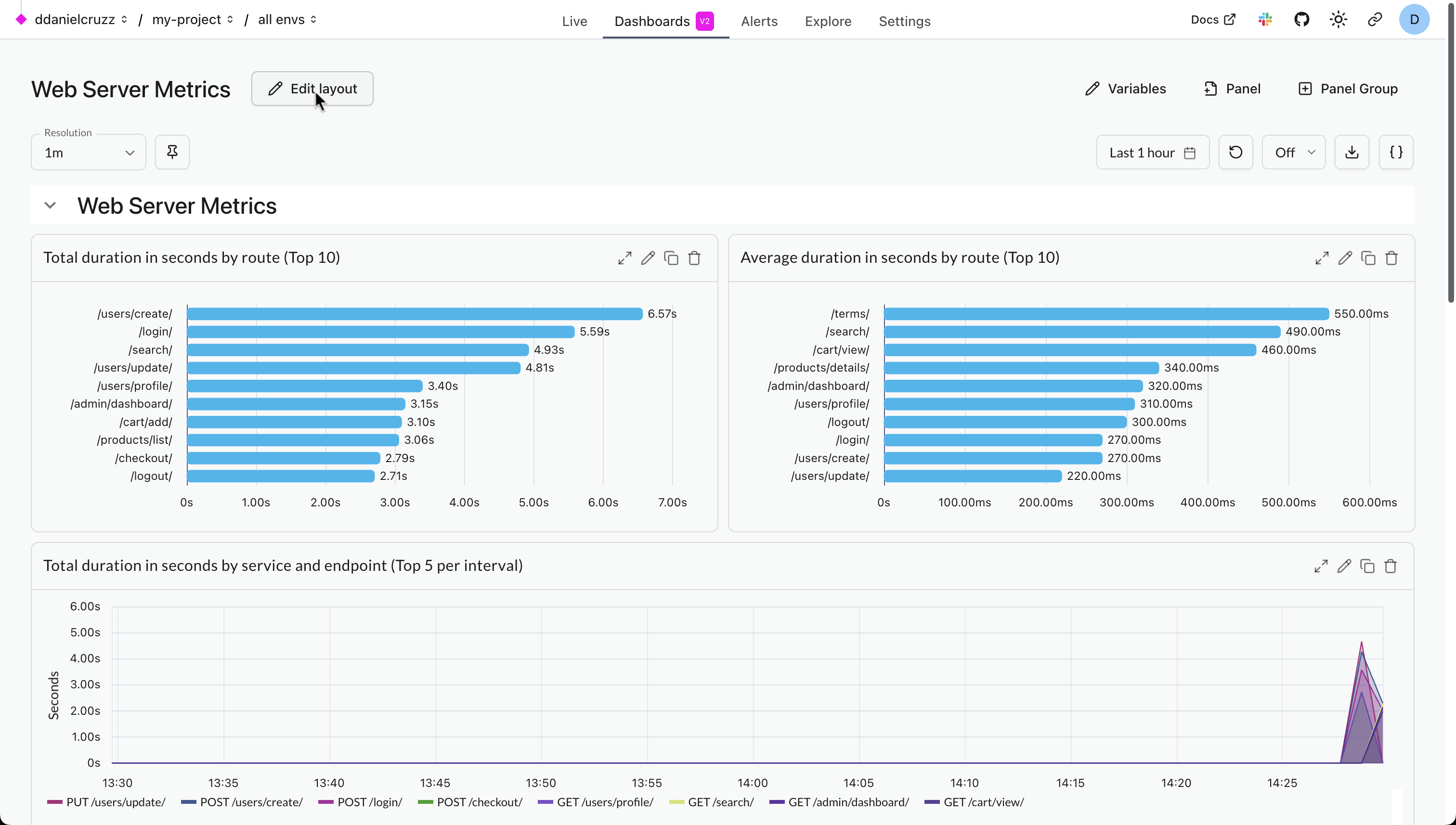 This dashboard gives an overview of how long each of your web server endpoints takes to respond to requests and how often they succeed and fail. It relies on the standard OpenTelemetry http.server.duration/http.server.request.duration metric which is collected by many instrumentation libraries, including those for FastAPI, Flask, Django, ASGI, and WSGI. The charts give a breakdown by endpoint (and sometimes status code) both overall and over time. Hover over each time series to see the most impactful endpoint at the top of the tooltip. The charts show: